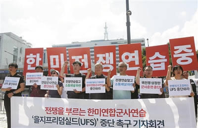 参加集会的韩国民众手持“反对核战争演练”“拒绝军事演习,构建沟通渠道”等标语,高呼“反对参加韩美军演”“停止韩美军演”等口号。