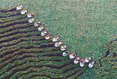 10月4日,农民在江苏省泰州市海陵区苏陈镇张家院社区菱塘里采摘菱角(无人机照片)。 新华社发(汤德宏 摄)