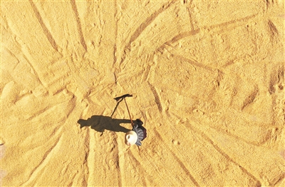 10月4日,在湖南省衡阳市衡山县白果镇,村民在晾晒稻谷(无人机照片)。金秋时节,各地陆续进入收获季,到处洋溢着丰收的喜悦。 新华社发(曹正平 摄)
