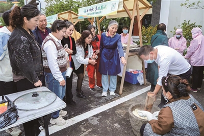 在“向往的市集”上,现包现蒸的米粿鲜香可口,现场制作的麻糍香甜软糯,刚出锅的油沸馒头酥脆蓬松。桂花酒、桂花酱、桂花茶等旧县本地桂花产品销售火热,套圈游戏引得众人参与。市集上,旧县味道令人垂涎,丰收展品琳琅满目。来自杭州的游客王伟正拎着大包小包,愉快地说:“我们几个姐妹买了麻糍、米粿,准备带给亲友尝尝。在丰收节办市集,极具创意,让活动更好玩。”
