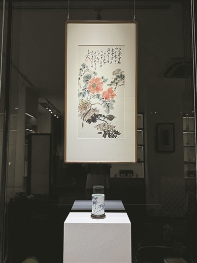 展览现场布置典雅,每件书画及瓷器都被精心安排,力求让观众感受到艺术的魅力和文化的深度。此外,明羽还题写了“汇入文心”四字,以此作为展览的精神指引。