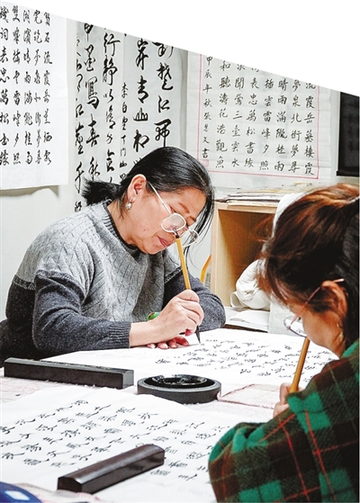 赵老师凭借着扎实的书法功底、耐心细致的教学态度以及对书法艺术独特的理解,为书画社吸引了一批忠实“粉丝”。一位正在练习隶书的退休阿姨说,“一有空就来书画社练字,写字很好,感觉心性都变得更加沉稳了。”说罢,阿姨拿起毛笔,继续专注地书写起来。