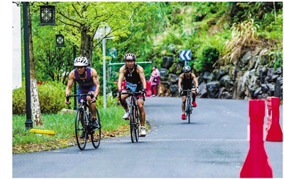 自行车运动爱好者在桐庐美丽的乡村公路上畅快骑行。