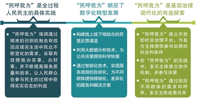 “民呼我为”是全过程人民民主的具体实践。首先,全过程人民民主强调人民是民主的主体,人民性是其本质属性。“民呼我为”彰显了为人民服务的宗旨,践行以人民为中心的观念,体现了社区党委和政府部门对人民呼声和诉求的积极响应,是人民当家作主的具体体现。其次,全过程人民民主注重民主的全链条、全方位、全覆盖,强调民主过程的完整性和参与性。“民呼我为”要求建立完善的民意搜集、征询和反馈机制,不仅涉及民主选举、民主协商、民主决策等关键环节,还涵盖了民主管理、民主监督等后续环节,确保了民主过程的完整性和连续性。最后,全过程人民民主追求最广泛、最真实、最管用的民主。“民呼我为”强调通过精准的识别机制去有效回应现实生活中民众不断变化的需求,在及时了解群众需求和意见的基础上,采取有效措施办实事、办好事,并不断提高服务质量和效率,让人民群众在参与民主的过程中获得实实在在的利益,从而增强民主的真实性和有效性。
