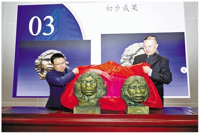 12月26日,“郧县人”1号(左)、2号头骨化石科学相貌复原头像揭幕。