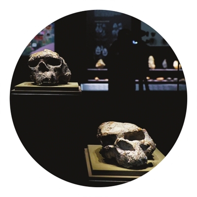 当天在湖北省博物馆拍摄的“郧县人”1号(右)、2号头骨化石。新华社记者 肖艺九 摄