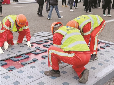 下雨天,市民最怕走人行道遭遇“水老鼠”。现场还展示了一种新工艺——柔性环保装配式人行道施工工艺,彩色的橡胶材料,踩上去脚感很舒适,可提前按需求定制,工人们像“拼积木”一样组装。“每块人行道砖底部的纵横结构与四边的12个渗水孔组成排水网,利于雨水、积水的排放,确保冬季降水降雪后地面防滑无积水。”工作人员介绍。