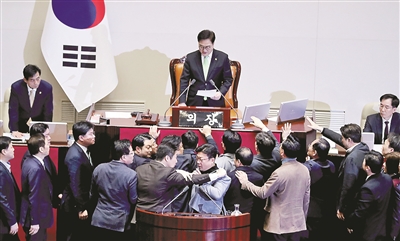 12月27日,在韩国国会,执政党议员与在野党议员发生肢体冲突。