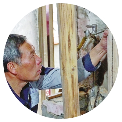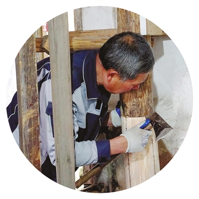 陈关富修缮老宅柱子。
