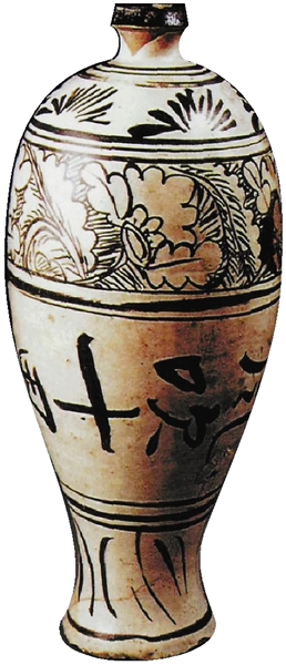 除了酒的名号外,一些话酒诗文也会成为“韩瓶”的装饰。有一件北宋梅瓶上,刻有“武陵城里崔家酒,天上应无地下有”诗句,这改编自唐代诗人张白的诗作,题作《赠酒店崔氏》,“武陵城里崔家酒,地上应无天上有。南游道士饮一斗,卧向白云深洞口”,烧制韩瓶时,“地上无”变成了“地上有”,实为吹捧自家好酒。