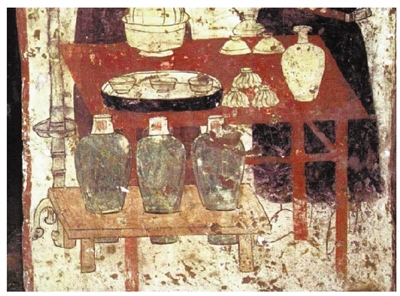 河北宣化张文藻墓出土过一只装满酒的“韩瓶”,瓶口有封泥。在墓内壁画上,也能观察到一只“韩瓶”上有红色封泥。封泥擢印,拆封开酒,欧阳修有诗云“滑公井泉酿最美,赤泥印酒新开缄”,所谓“赤泥印酒”,当是指红色酒封之上有官府押印。