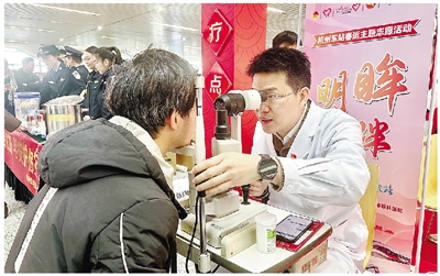 本报讯(通讯员 董凝凝 包单霖 记者 叶佳裕 文/摄)2025年春运开启,为了给旅客提供眼睛呵护,同时科普眼部健康知识,浙江省眼科医院杭州院区昨起在杭州东站28B检票口前推出为期十天的眼科义诊活动。开诊首日,前来问诊的旅客络绎不绝。