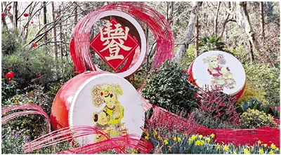 “鼓舞蹁跹,丰饶之年满载欢腾”,杨公堤三角花坛则紧紧围绕“鼓”这一核心元素展开设计,鼓面造型丰富多样,巧妙融入年画、斗方等独具韵味的元素,运用竹篾等植物材料,精心打造大气开合且灵动飘逸的红色飘带,处处蕴含着中国传统新春的文化内涵,搭配新春特色植物,营造出了热烈喜庆的节日氛围。记者 张之冰 摄