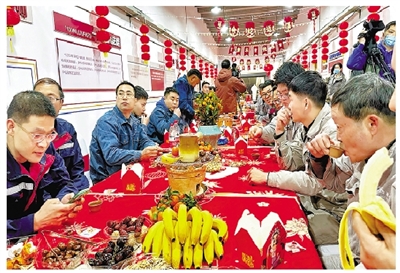 中午时分,“职工团圆饭”温暖开席。嘉宾和工人一起包饺子,大家围在一起、分工合作,有的擀皮、有的包馅、有的煮饺子,欢声笑语此起彼伏。不一会儿,一盘盘热气腾腾的饺子就端上了桌。工人们一边品尝着亲手包的饺子,一边聊着家常,脸上挂满幸福笑容。