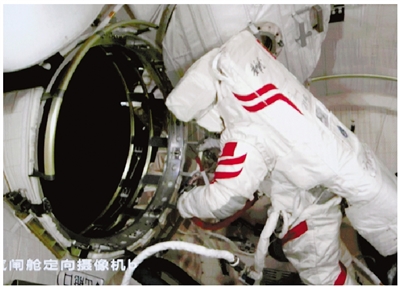航天员蔡旭哲在气闸舱舱门内工作。新华社发