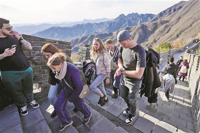 2024年11月4日,外国游客在北京慕田峪长城游览。 新华社发