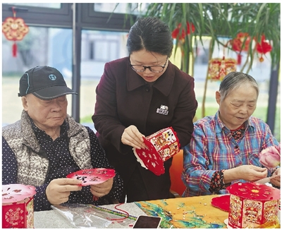 市三福院春节假期坚守岗位的工作人员陪老人们做花灯。 市三福院供图