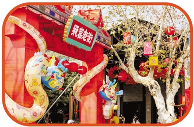 夜幕降临,穿过由两条威武的小蛇盘旋的正大门,就到了瓶窑电影院。抬头看,一条50多米长的空中花灯长廊,盘旋着两条25米长的蛇灯。一白一青两条Q版的蛇正在“嬉闹”,呼应的正是《白蛇传》中的白蛇、青蛇。