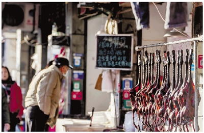 十五奎巷里年味十足,酱鸭、火腿、腊肠、糕点等传统食品深得周边居民喜爱。 记者 王毅 摄