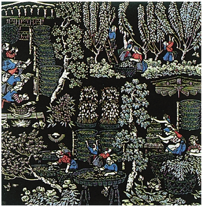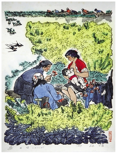 同样,在创作另一幅重要的版画代表作品《四季春》(1960)时,赵宗藻先生也吸取了民间绘画语言并融入创作实践中。这幅作品以歌颂妇女们的劳动和创造为主题,通过突破时间、空间的限制,将四季养蚕的场面巧妙地布置在同一个画面上。画面中的人物形象生动传神,色彩搭配和谐统一,充分展现了赵宗藻先生对民间绘画语言的深刻理解和巧妙运用。