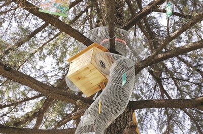 去年冬天,学生们常见松鼠奔跃于校外雪松上,便生出奇想,有无办法请这些“伙伴”进校内雪松上玩耍?该校副校长张文浩决心帮助孩子们达成心愿,“既‘牵手’了松树,也请进了松鼠,还能给孩子们上动物观察课。”张文浩说。
