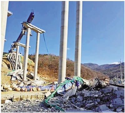 2月25日在韩国忠清南道天安市拍摄的在建桥梁坍塌事故现场。