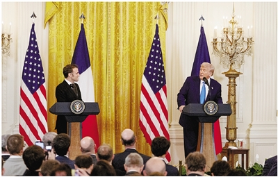 2月24日,美国总统特朗普(右)在华盛顿白宫与到访的法国总统马克龙举行会谈后的联合记者会。