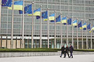 近日,在比利时布鲁塞尔,人们走过欧盟总部。欧洲理事会2月27日发布声明说,将于3月6日召开欧盟特别峰会,专门讨论欧洲防务和乌克兰问题。 新华社记者 孟鼎博 摄