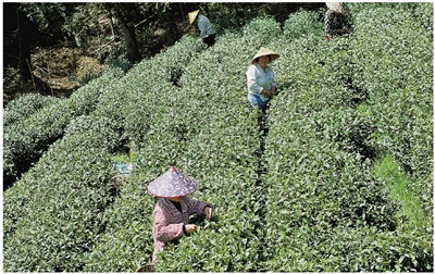 3月25日,在西湖景区双峰村的茶园里,三五成群的采茶工忙着采摘明前西湖龙井春茶。由于前期雨水充足,加上近期气温持续回升,龙井43号茶芽已进入全面生长期,自3月20日西湖龙井正式开采以来,采摘量逐日递增,新茶也陆续上市。记者 李忠 摄