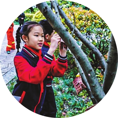 活动中,孩子们与养护工人协作悬挂捕食螨挂袋。市园文局供图