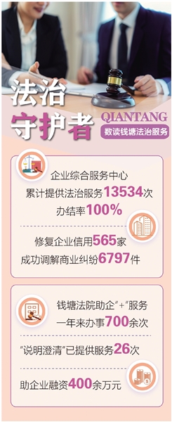 以法治之力为企业纾难解困,这正是钱塘区以高水平法治护航产业高质量发展的生动实践。近年来,钱塘依托“行走的办事大厅”活动载体,积极优化法治营商环境,其中“企业涉诉信息说明澄清项目”已助企业融资400余万元。