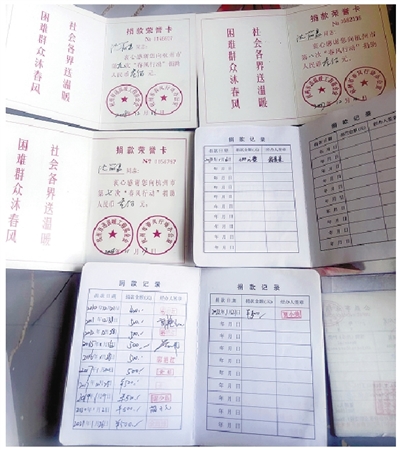 沈丽君多年来参与“春风行动”捐款的记录和部分荣誉卡。