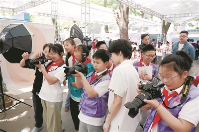 学生在杭州市创意艺术学校的展位体验当摄影师。