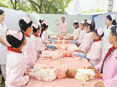 文汇学校展位上,学生们体验护士照顾新生儿。