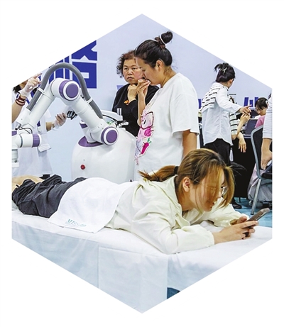 场馆的另一边,俏郎中中医机器人和外骨骼康养机器人“圈粉”了一波爷爷奶奶。老人们排队落座,将手搭在白色的把手上,屏幕上显示出周身12条经络的堵塞情况及健康隐患。“这个机器人诊断得还蛮准的,医生也说过我脾胃不大好。”“哎,你显示已经中度亚健康了,要注意了。”这片集中了多个康复辅助诊疗机器人的展区已秒变逛展老人的“养生互动区(图4)”。