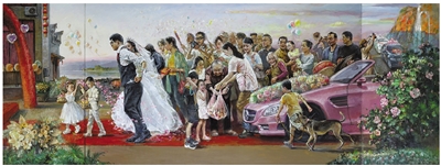 “我画里的每一个人都是有真人的。”周瑞文说。生活化,是他艺术创作始终坚持的重要原则。《乡村婚礼》中的拿糖果老太太,偷看的小男孩、不敢上前的小女孩、举着相机的婚礼摄影师,所有人物都取材于他采风途中真实遇见的人们。就连作品背景的山水风光,也源自他的故乡——海盐南北湖。