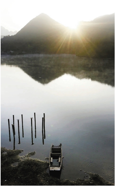 然后,太阳终于爬出湖对岸的山头了,短短一两分钟,就从微光变成了光芒四射,完全照亮了湖面。万物苏醒了。村子里,也传来了少许村民外出干农活儿的脚步声和对话声。