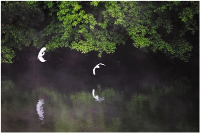 住在山上湖边,特意早起看日出。湖面的水雾随风游走,三五只白鹭醒来,时而绕湖轻飞,时而栖息在对岸的树枝上。湖里的鱼儿也醒来了,偶尔跃出水面,漾起涟漪一圈圈。随着时间一分钟一分钟往前走,早起的几只水鸭也开始在湖面上活动。在阳台上独坐,不时有清脆的鸟鸣和公鸡的打鸣。