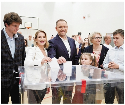 6月1日,纳夫罗茨基(左三)和家人在波兰首都华沙一处投票站投票。 新华社发(亚普·阿林 摄)