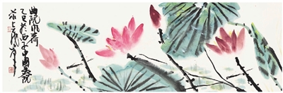 蒙上茂笔下百花飞鸟、鱼虫走兽,皆生机流溢。尤为擅绘者,当属荷花。其荷承袭周敦颐笔下“出淤泥而不染,濯清涟而不妖”的风骨,千姿百态而意蕴高洁——艳而不俗,美而不妖,贵而不奢,深得爱荷者与藏家珍视。这份对荷的钟情,亦与其栖身之所“望楼居”相契。其画室坐落于荷花池头巷内,推窗即望一代宗师潘天寿故居。先贤的无声感召,常化为其笔底涌动的激情与遇挫弥坚的信念。