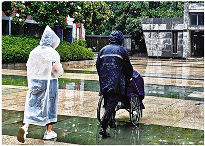 6月8日,高考第二天,杭州迎来瓢泼大雨。上午的科目结束后,杭州第四高级中学下沙校区的考生们陆续离开。空荡的校园里,一位考生披着雨衣,坐在轮椅上,考生的母亲撑着伞,在身后吃力地推行。