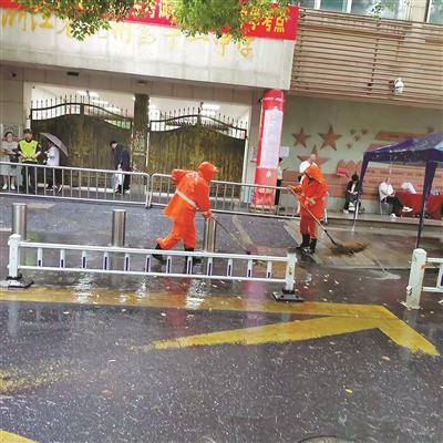 6月10日上午7点30分,正值高考进场高峰期,杭州市第十一中学周边部分路段出现积水,最深处已没过脚踝。大关街道南苑社区执勤保安立刻联系路面保洁小组,第一时间冒雨奔赴积水现场,展开应急清理工作。在保洁小组全体成员的高效协作和不懈努力下,不到半小时,原本积水的路段被快速清理干净,路面恢复畅通。