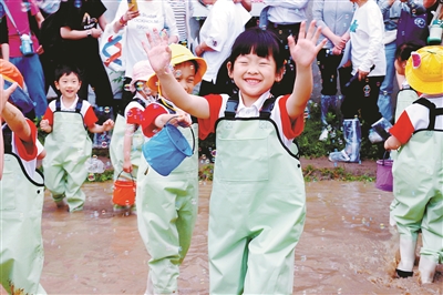 他们在家长与老师的看护和指导下,套上防水衣,穿好小雨靴,进入泥田抓泥鳅、创作泥巴画,尽情撒欢,完成了一场与自然的亲密接触。尽管雨季来临,泥田湿滑泥泞,孩子们依然兴致不减,迅速打成一片。待到活动结束时,有些“自来熟”的小朋友已经收获了新玩伴。