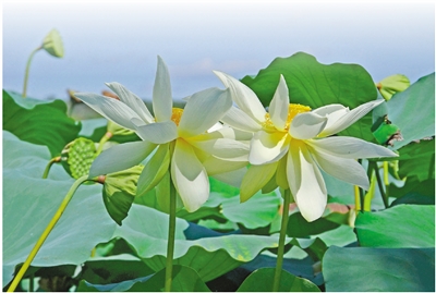 盛夏的清晨,一丛丛荷叶翠绿,点缀朵朵荷花,微风吹拂,“黄舞妃”慢慢舞动,令人陶醉。