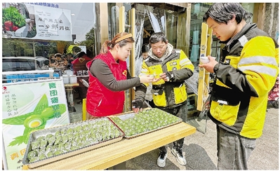 今年清明节前夕,萧山区北干街道钱塘明月社区在先锋骑手驿站举办“清明寄思念 青团传暖意”活动。记者 李忠 摄