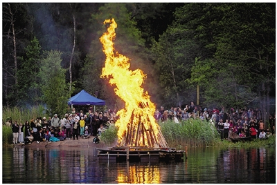图为6月20日,在芬兰首都赫尔辛基伴侣岛举办的仲夏节前夜庆典上,人们在海边燃起篝火。仲夏节是北欧地区传统节日,人们载歌载舞,庆祝夏季美好时光的到来。据新华社消息