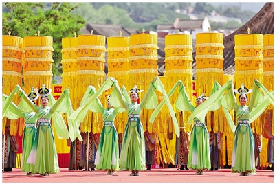 图为6月21日,演员在公祭伏羲大典上表演乐舞告祭仪式。当日,2025(乙巳)年公祭中华人文始祖伏羲大典在甘肃省天水市举行。天水是伏羲文化的发祥地,有“羲皇故里”之称。