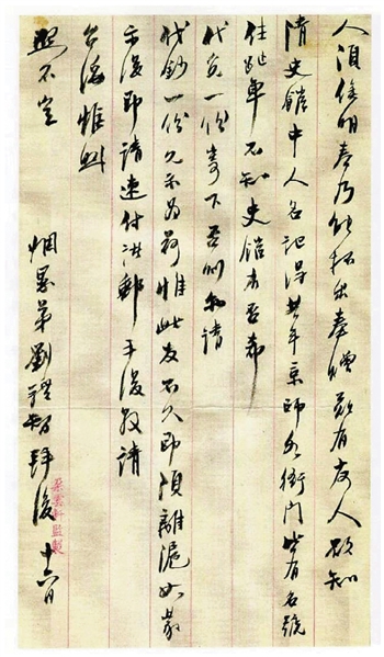 刘体智擅长楷、行、篆诸体,在继承传统路线的同时,也体现出自己的个性和对书法传统经典的理解。其楷书上溯魏晋,取法钟繇,对《宣示表》《荐季直表》《力命表》等都下过一番苦功。以刘写给古文字学家容庚的函为例,笔画粗细、长短不一,有许多隶书的笔意,偶有行书用笔方式,结体内松外紧,突破点画间的匀称分布,使字内有大块之白,而留白处又有奇变,且大小不等、顾盼生姿,通篇横无列、竖成行,行距较大,意蕴空灵,清新古雅,深得“钟(繇)书”三味。当然,刘书中最精彩的当属行书。其宗法“二王”,特别是对《圣教序》,穷心研悟,颇有心得。他早期作书多喜上下字之间连笔,以求气脉贯通,有时难免略显做作,后期则基本字字独立,虽笔断而意连,行气自溢,更为可观。