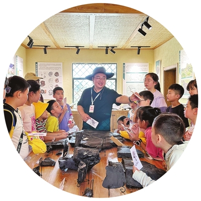 ①发现于李家的古生物化石。②在乡村化石馆举办研学活动(资料图片)。③与会嘉宾参观李家乡村化石馆。