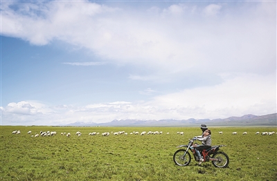 右上图:6月26日,先巴尖措在夏牧场骑着摩托放牧。